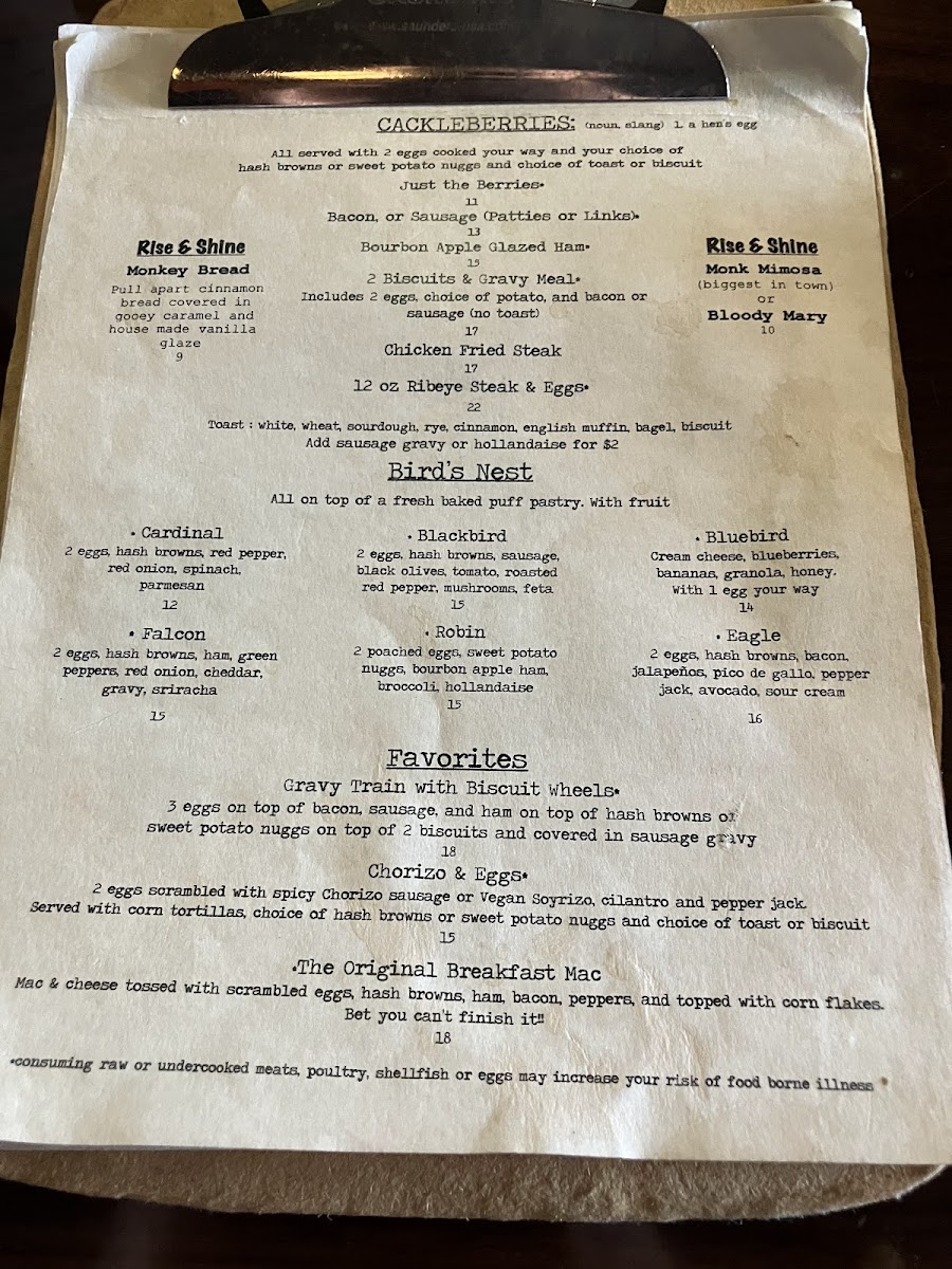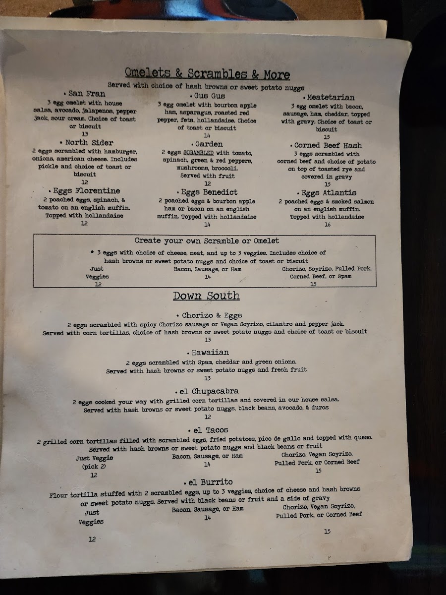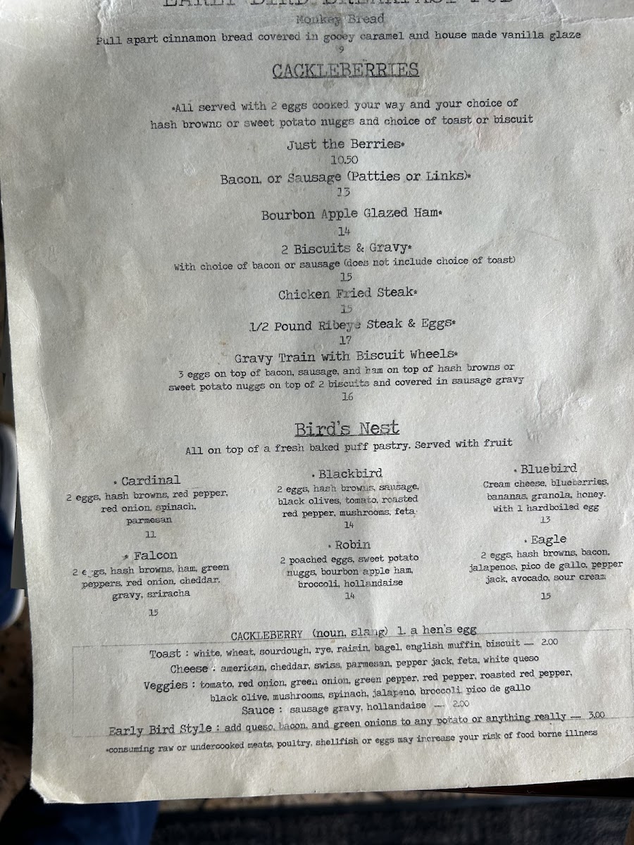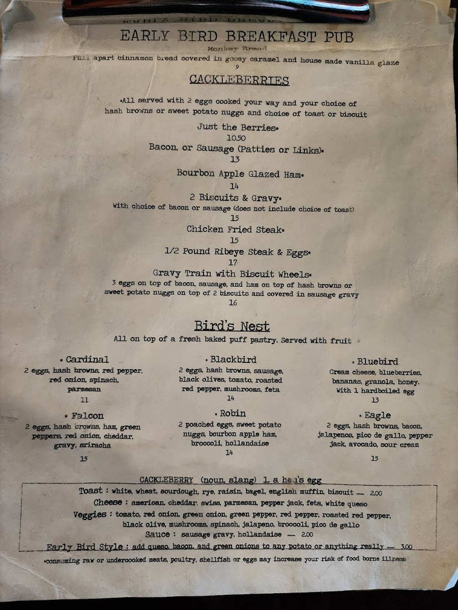 The menu at Early Bird Breakfast Pub offers a welcoming collection of hearty morning and midday meals designed to satisfy both early risers and those enjoying a relaxed brunch. With a focus on comforting classics and creative spins, you’ll find options ranging from savory breakfast tacos and fluffy omelets to indulgent dishes like breakfast mac and cheese or a generous ribeye steak with eggs.